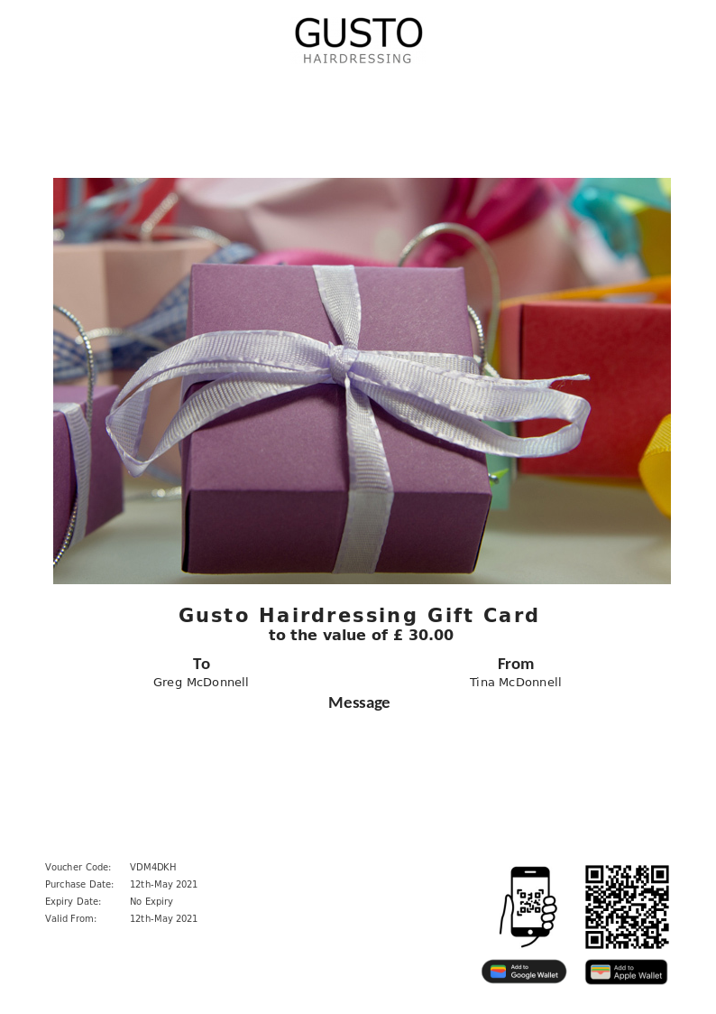 Gusto Hairdressing allows you to purchase instantly printable gift vouchers, special offers and tickets using the Voucher Connect platform.